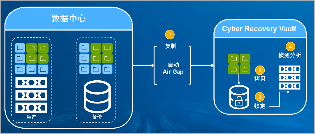 yy易游体育防勒索病毒方案将生产中心备份数据复制到Vault区,复制后网络自动断开实现弹性隔离。Vault区的数据快速拷贝,并对拷贝版本加锁(在锁定期数据不允许删除和修改)。Vault沙箱内对拷贝版本进行扫描分析,验证数据是否完好。